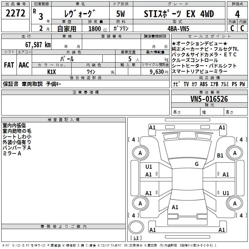 Subaru LEVORG с аукциона Японии TAA Kinki лот № 2272