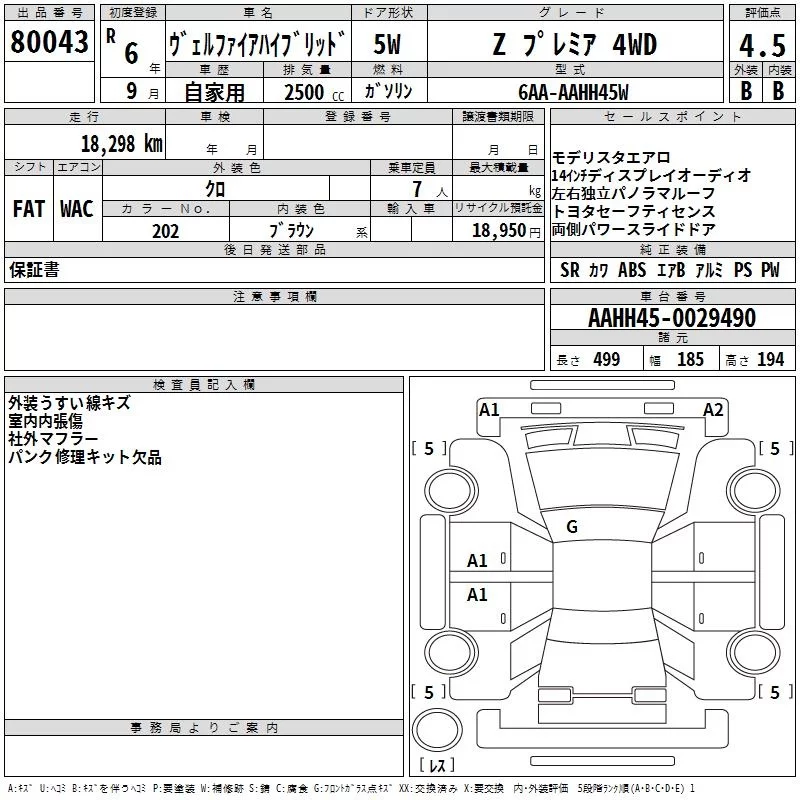 Toyota VELLFIRE с аукциона Японии TAA Kinki лот № 80043
