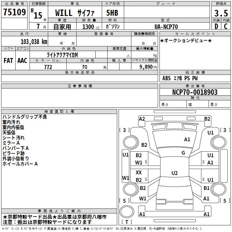 Toyota WILL с аукциона Японии TAA Kinki лот № 75109
