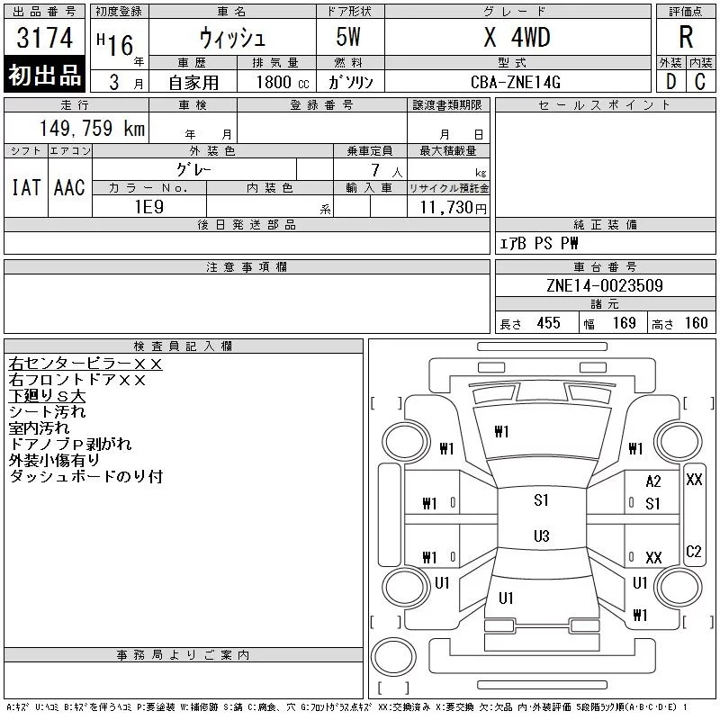 Toyota WISH с аукциона Японии CAA Tohoku лот № 3174