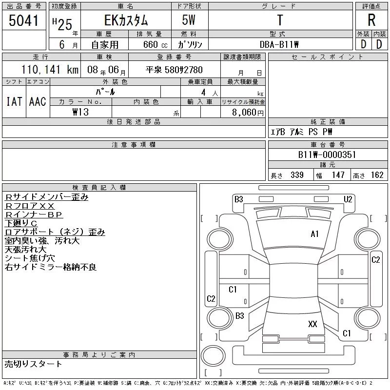 Mitsubishi EK CUSTOM с аукциона Японии CAA Tohoku лот № 5041