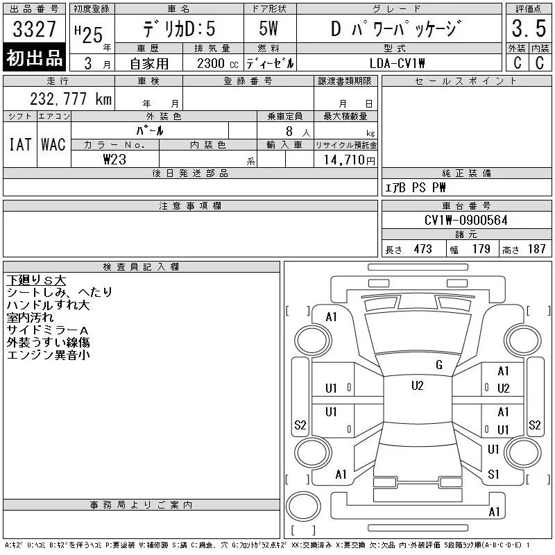 Mitsubishi DELICA D5 с аукциона Японии CAA Tohoku лот № 3327
