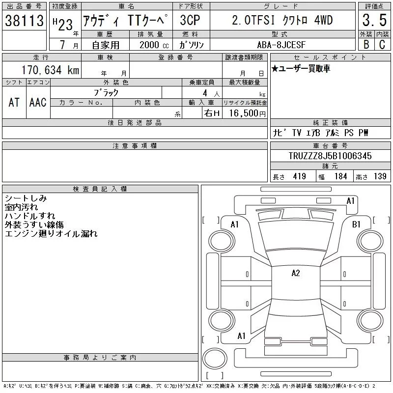 Audi TT с аукциона Японии CAA Tokyo лот № 38113