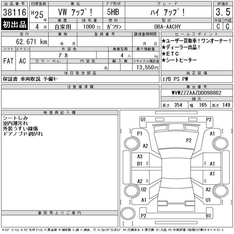 Volkswagen UP с аукциона Японии CAA Tokyo лот № 38116
