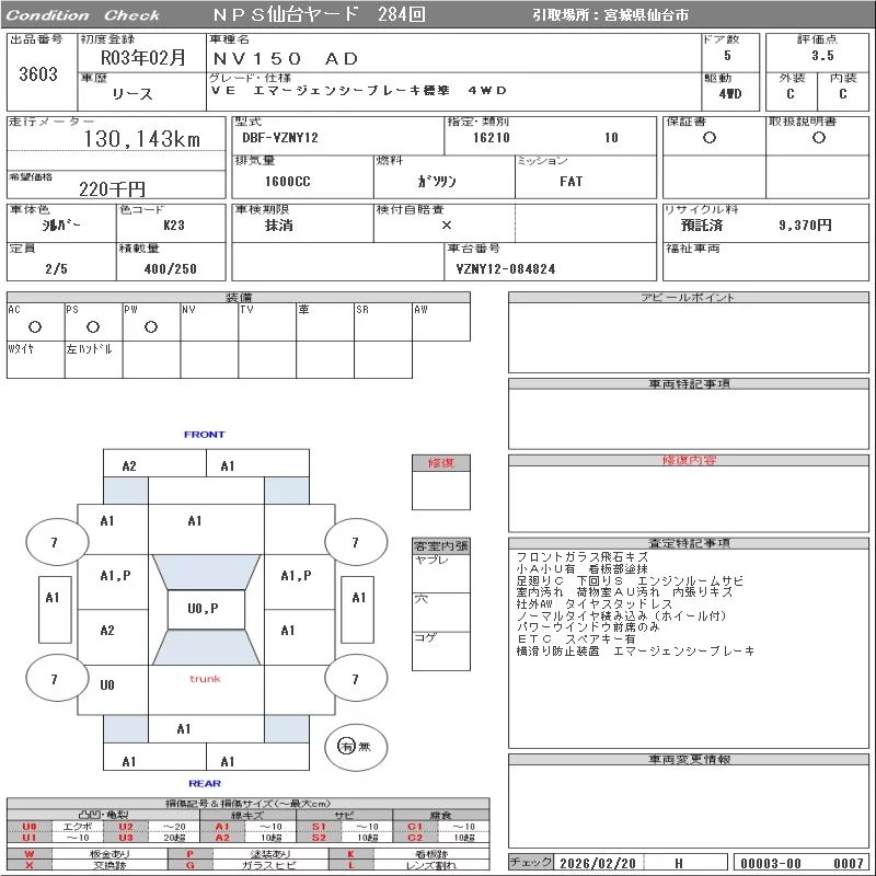 Nissan AD с аукциона Японии NPS Sendai Nyusatsu лот № 3603