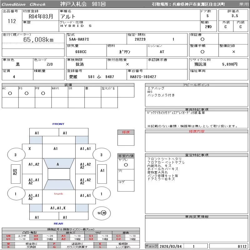 Suzuki ALTO с аукциона Японии ORIX Kobe Nyusatsu лот № 112