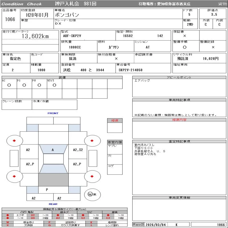 Mazda BONGO VAN с аукциона Японии ORIX Kobe Nyusatsu лот № 1066