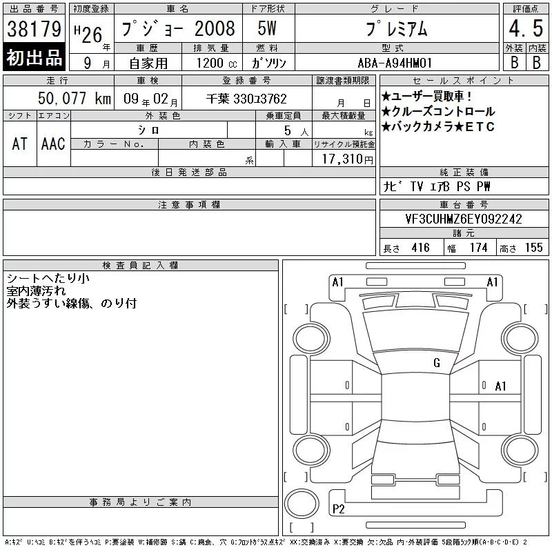 Peugeot 2008 с аукциона Японии CAA Tokyo лот № 38179