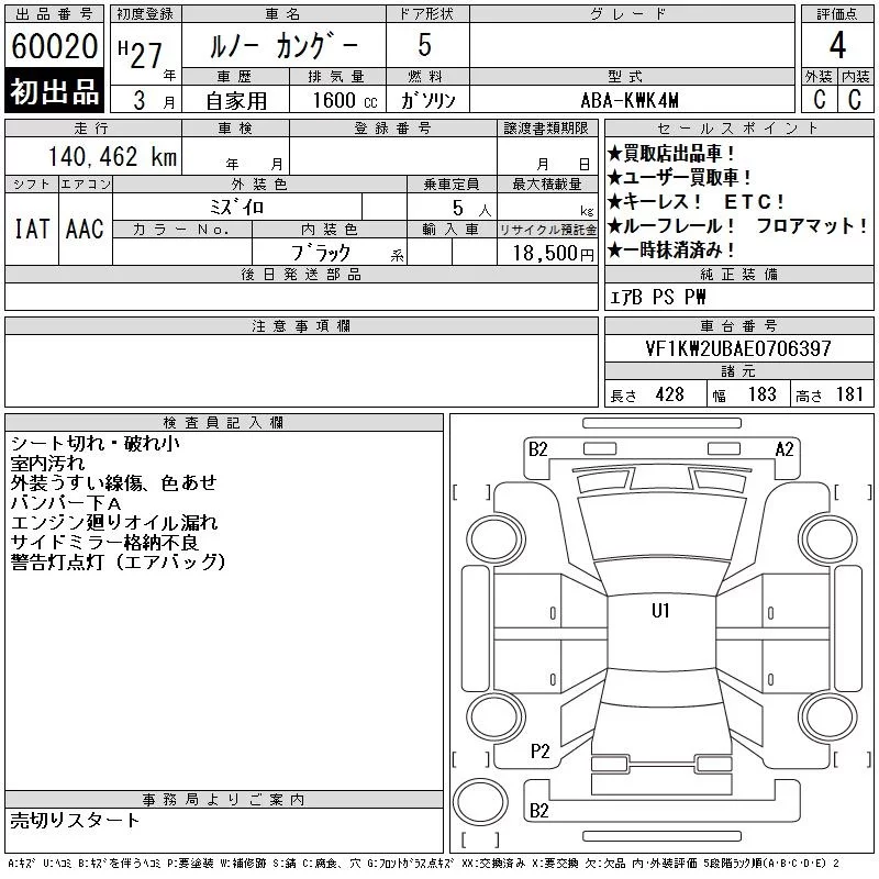 Renault KANGOO с аукциона Японии CAA Gifu лот № 60020