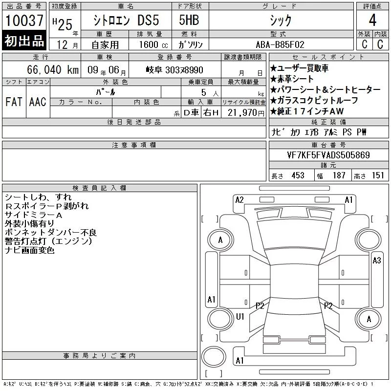 Citroen DS5 с аукциона Японии CAA Gifu лот № 10037