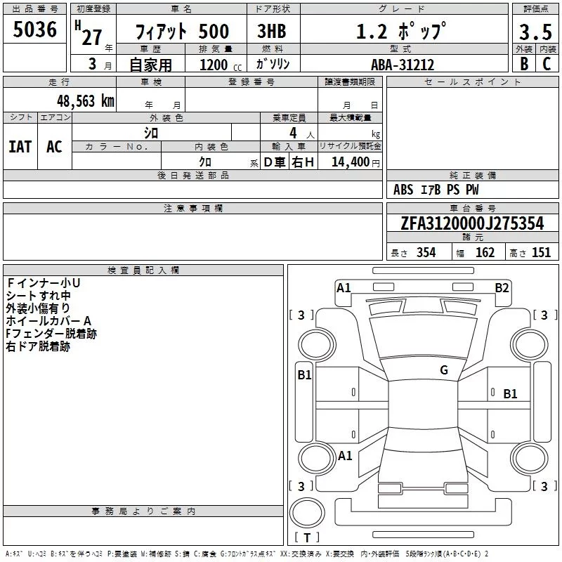 Fiat 500 с аукциона Японии TAA Kinki лот № 5036