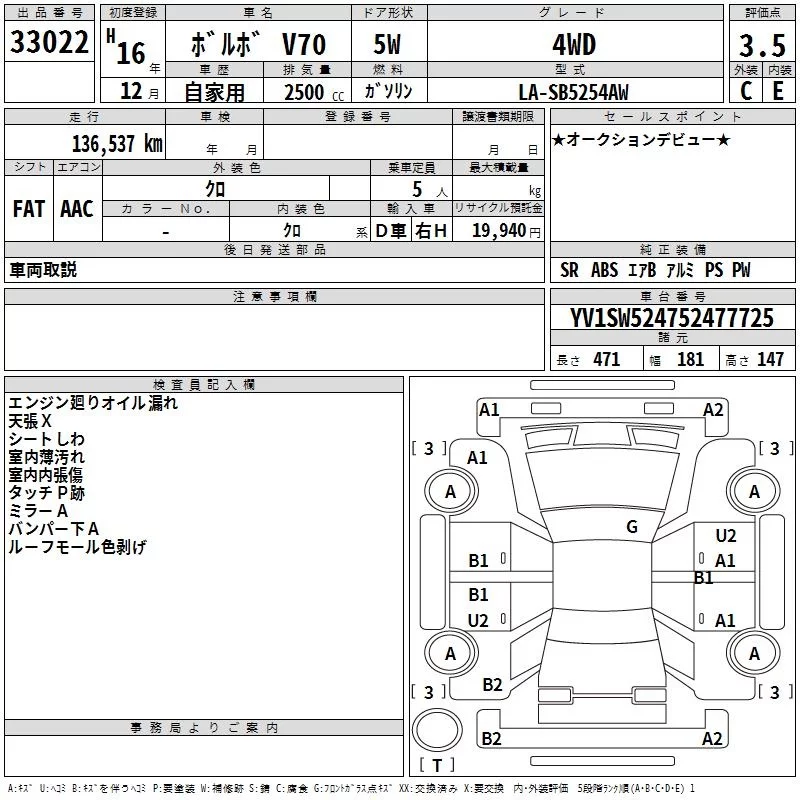 Volvo V70 с аукциона Японии TAA Kinki лот № 33022