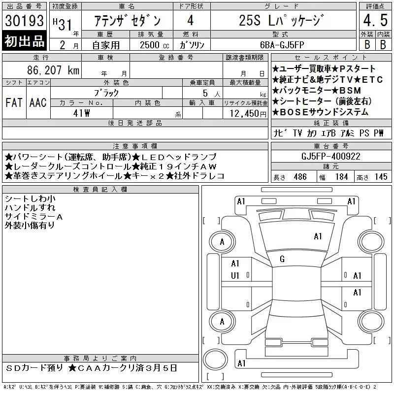 Mazda ATENZA SEDAN с аукциона Японии CAA Chubu лот № 30193
