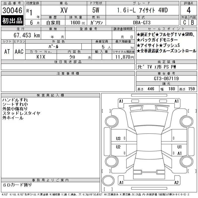Subaru XV с аукциона Японии CAA Chubu лот № 30046
