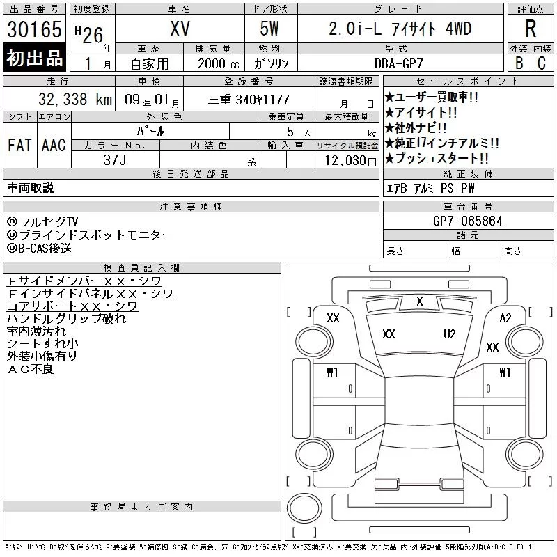 Subaru XV с аукциона Японии CAA Chubu лот № 30165