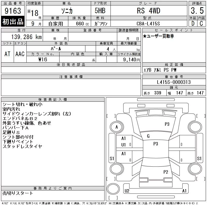 Daihatsu SONICA с аукциона Японии CAA Chubu лот № 9163