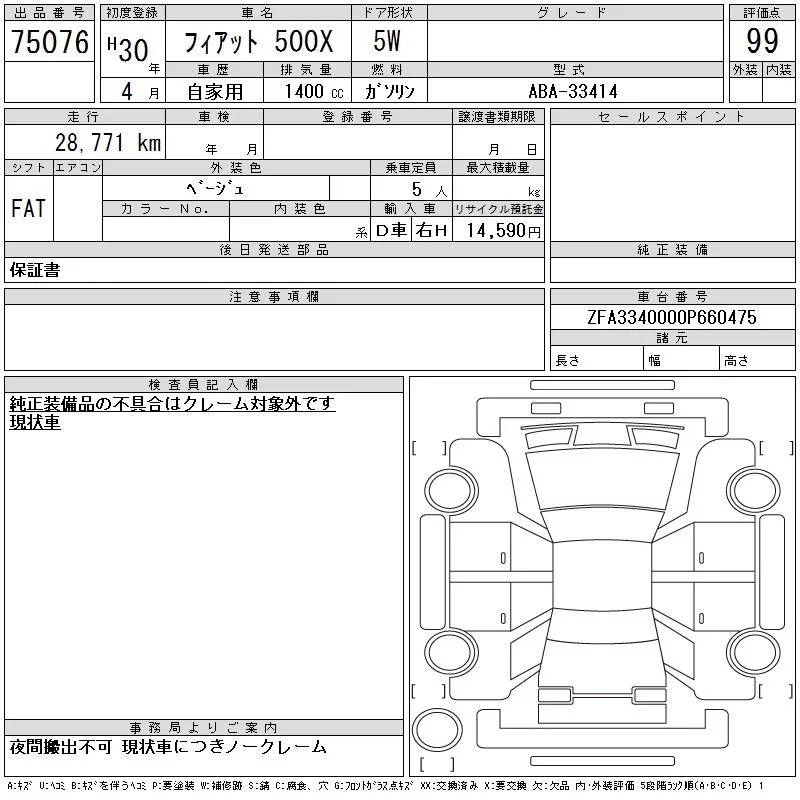 Fiat 500X с аукциона Японии CAA Chubu лот № 75076