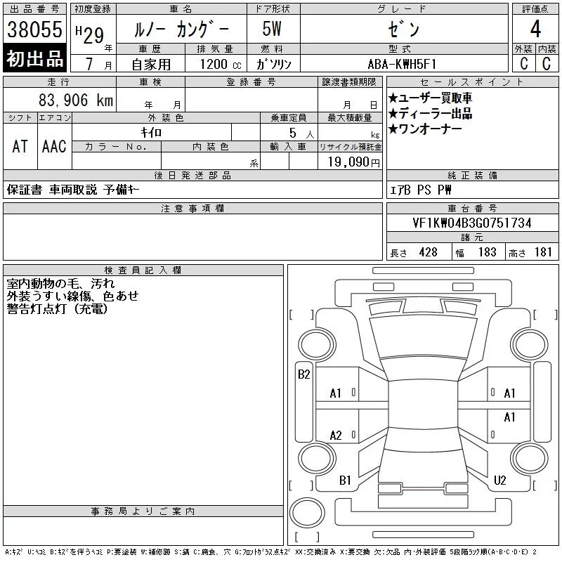 Renault KANGOO с аукциона Японии CAA Chubu лот № 38055