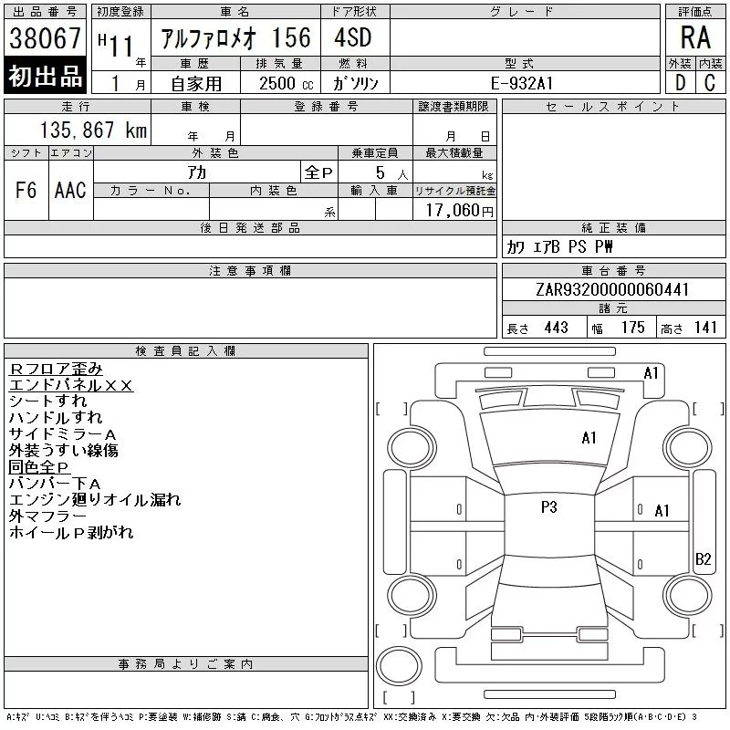 Alfa Romeo 156 с аукциона Японии CAA Chubu лот № 38067