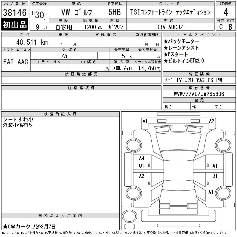 Volkswagen GOLF с аукциона Японии CAA Chubu лот № 38146