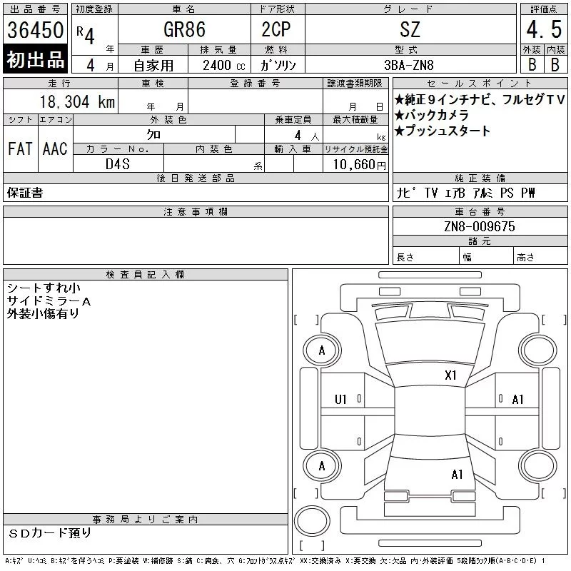 Toyota GT 86 с аукциона Японии CAA Chubu лот № 36450