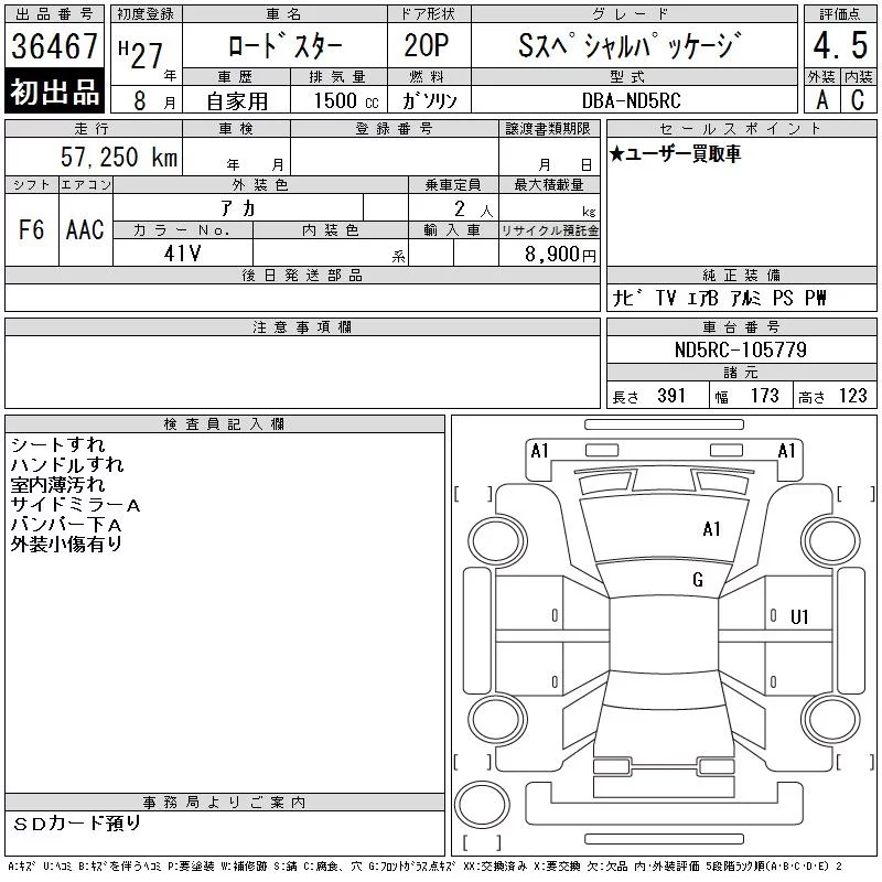 Mazda ROADSTER с аукциона Японии CAA Chubu лот № 36467