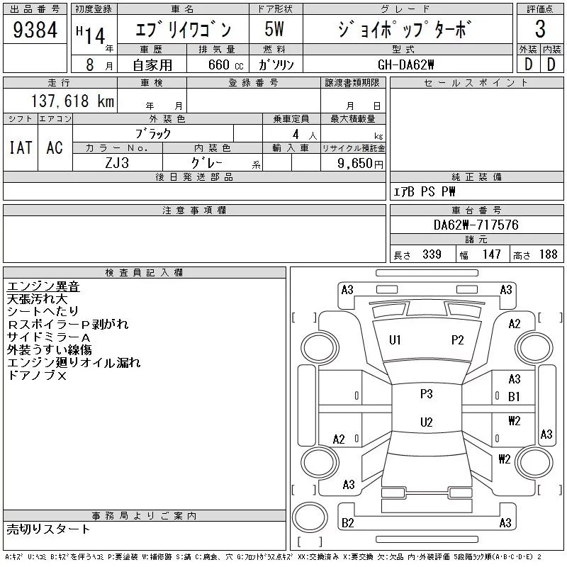Suzuki EVERY WAGON с аукциона Японии CAA Chubu лот № 9384