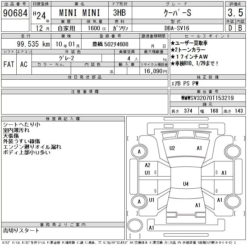 BMW MINI с аукциона Японии CAA Chubu лот № 90684