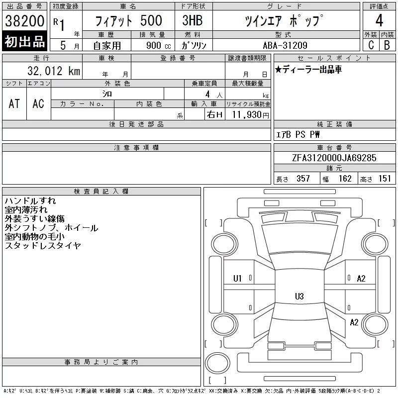 Fiat 500 с аукциона Японии CAA Chubu лот № 38200