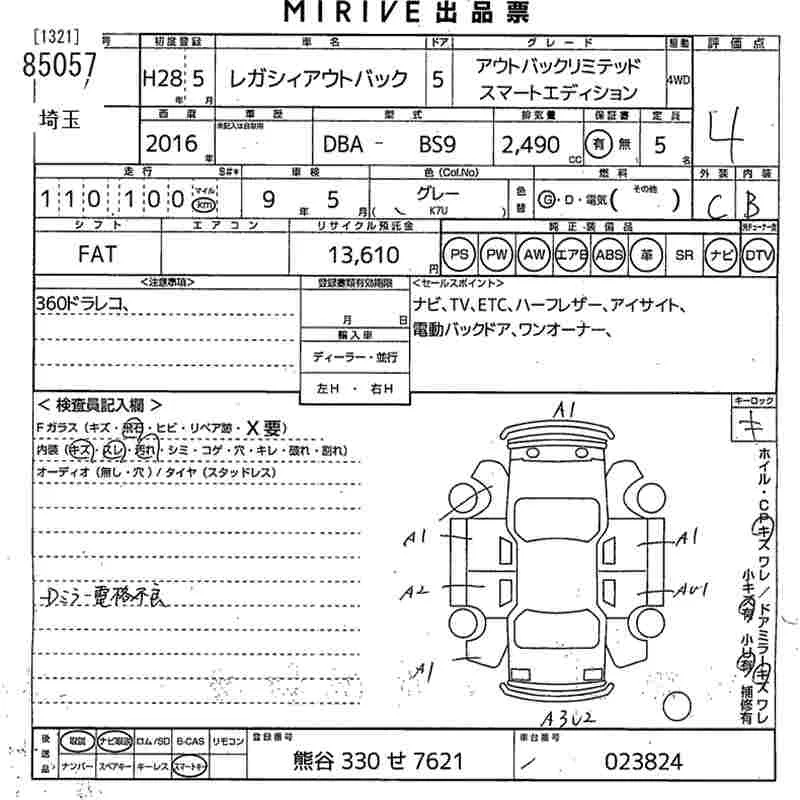 Subaru LEGACY OUTBACK с аукциона Японии MIRIVE Saitama лот № 85057