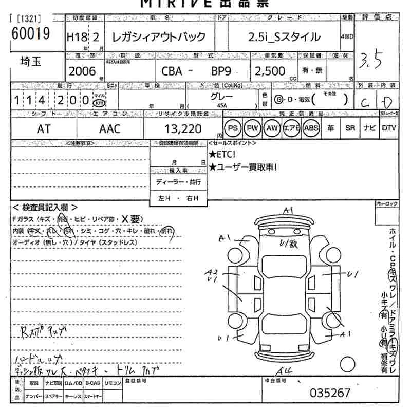 Subaru LEGACY OUTBACK с аукциона Японии MIRIVE Saitama лот № 60019