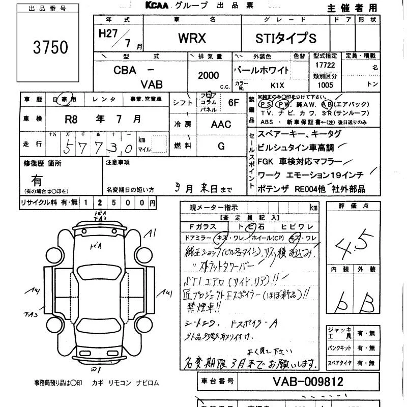 Subaru WRX с аукциона Японии KCAA Minami Kyushu лот № 3750