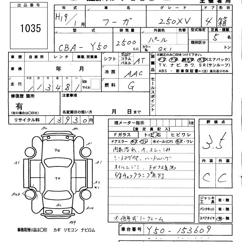 Nissan FUGA с аукциона Японии KCAA Minami Kyushu лот № 1035