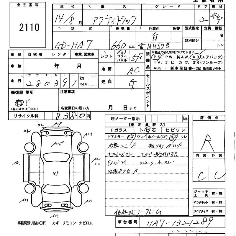 Honda ACTY TRUCK с аукциона Японии KCAA Minami Kyushu лот № 2110