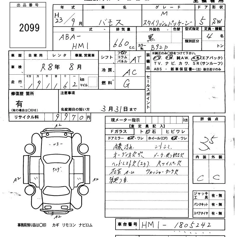 Honda VAMOS с аукциона Японии KCAA Minami Kyushu лот № 2099