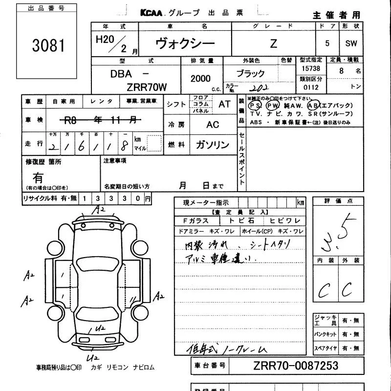 Toyota VOXY с аукциона Японии KCAA Minami Kyushu лот № 3081