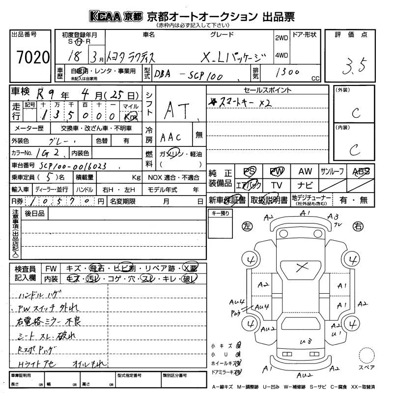 Toyota RACTIS с аукциона Японии KCAA Kyoto лот № 7020