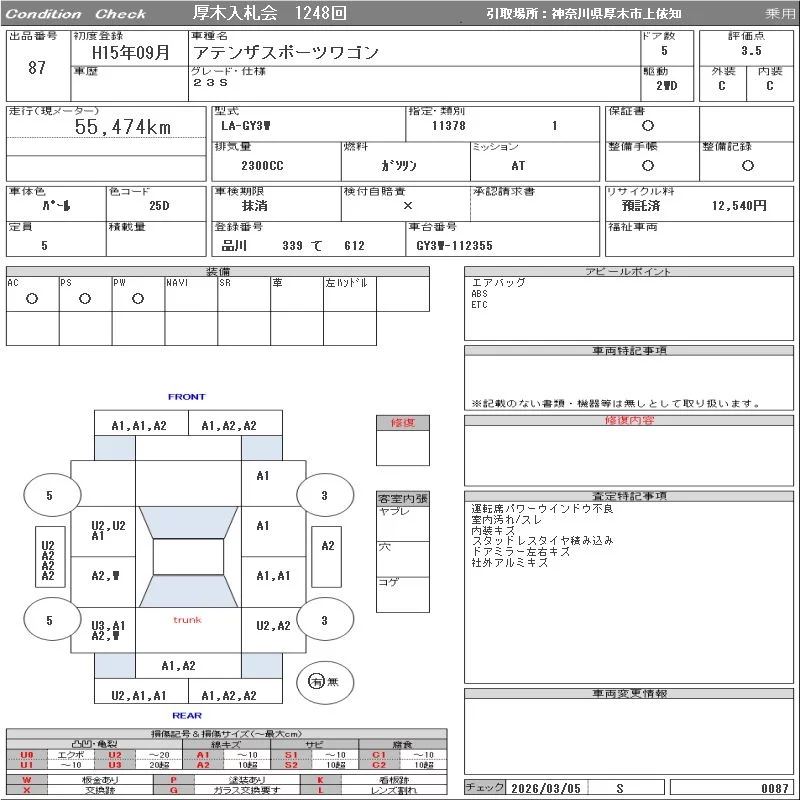Mazda ATENZA WAGON с аукциона Японии ORIX Atsugi Nyusatsu лот № 87