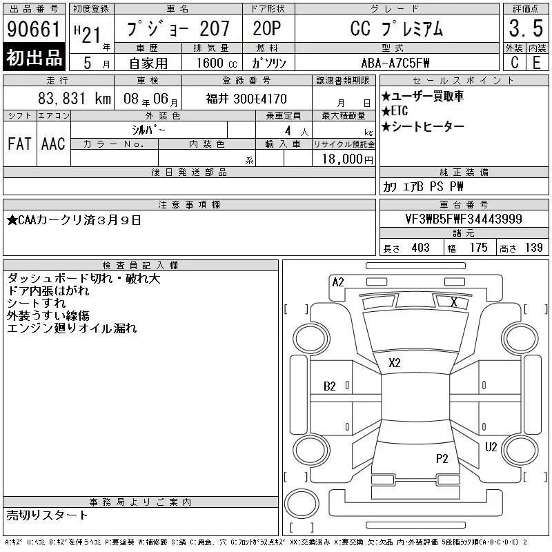 Peugeot 207 с аукциона Японии CAA Chubu лот № 90661