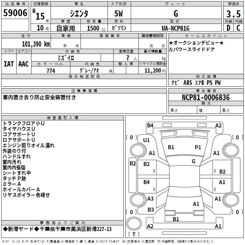 Toyota SIENTA с аукциона Японии TAA Kanto лот № 59006