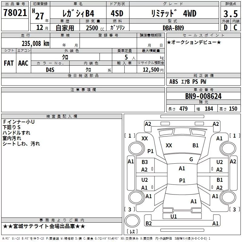 Subaru LEGACY B4 с аукциона Японии TAA Tohoku лот № 78021