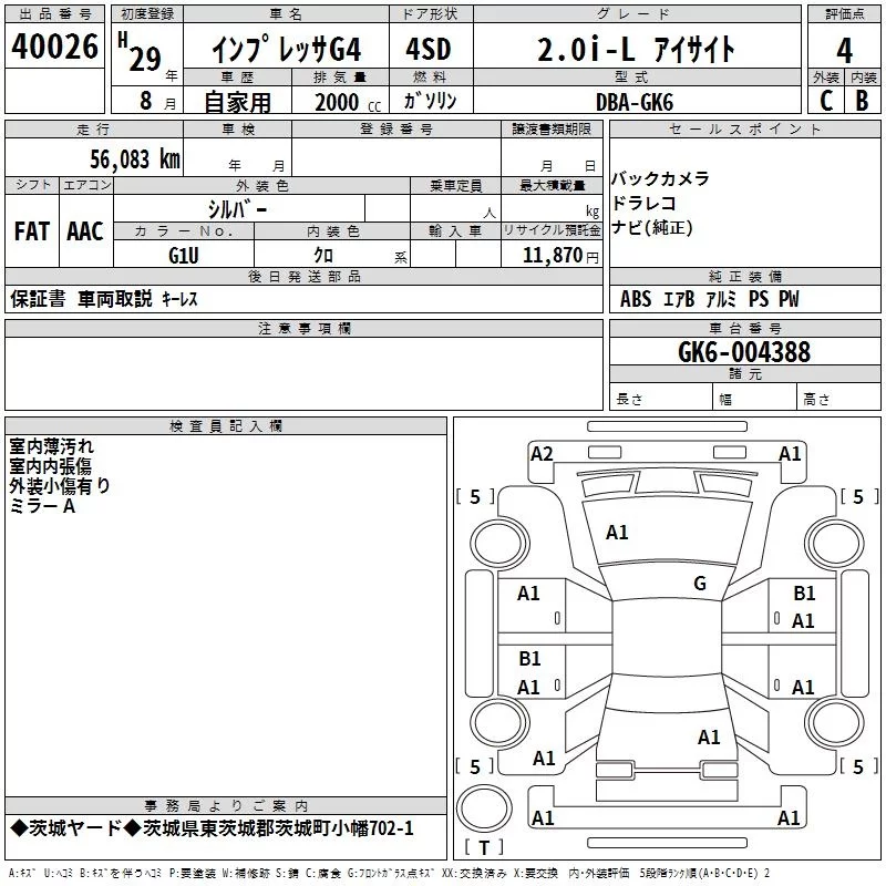 Subaru IMPREZA G4 с аукциона Японии TAA Kanto лот № 40026