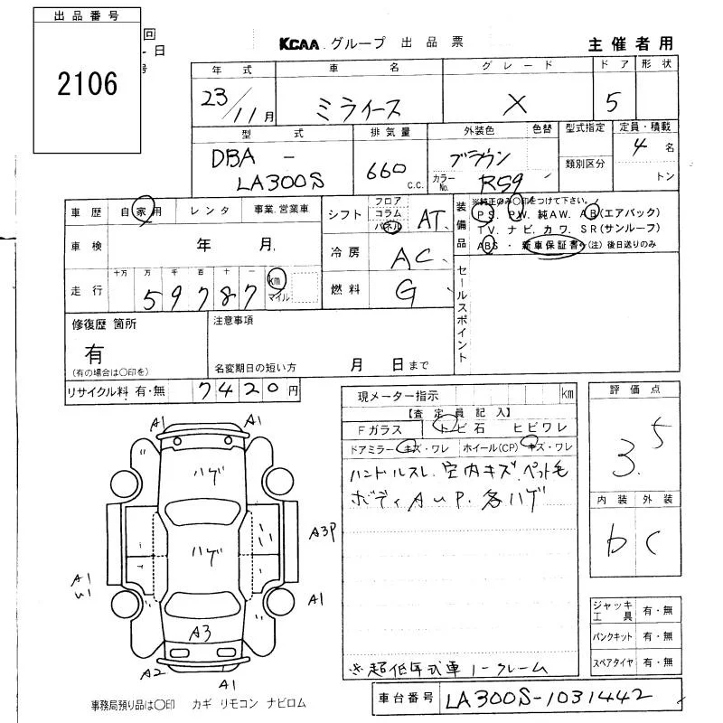 Daihatsu MIRA E S с аукциона Японии KCAA Fukuoka лот № 2106