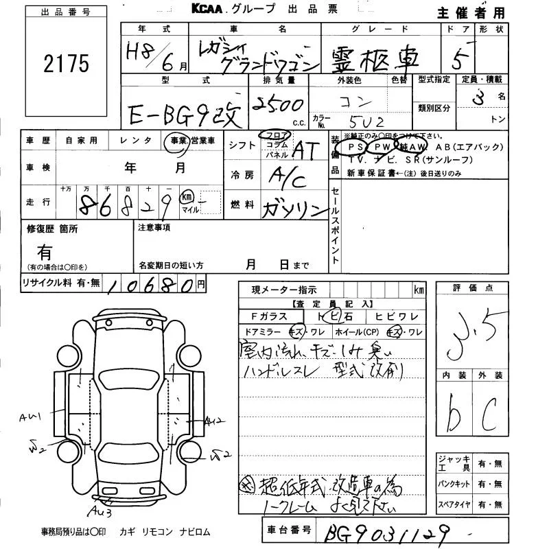 Subaru LEGACY с аукциона Японии KCAA Fukuoka лот № 2175