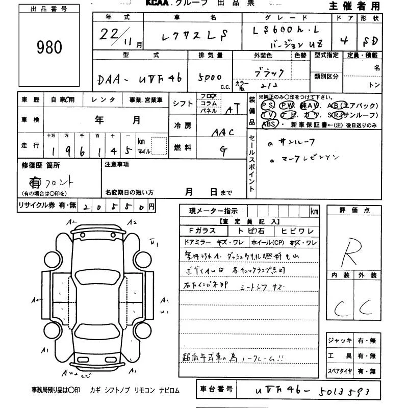 Lexus LS с аукциона Японии KCAA Fukuoka лот № 980