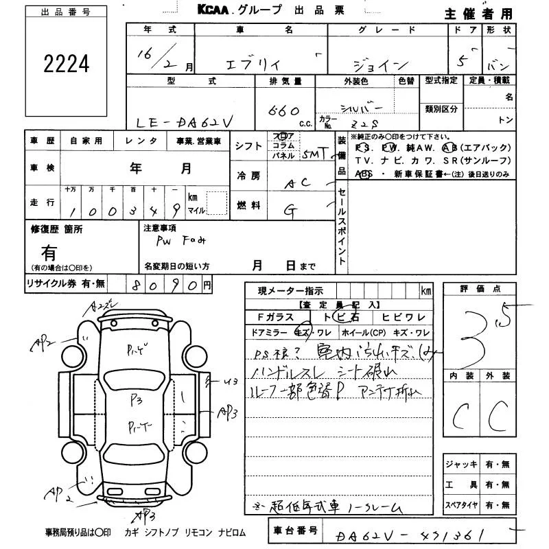 Suzuki EVERY с аукциона Японии KCAA Fukuoka лот № 2224