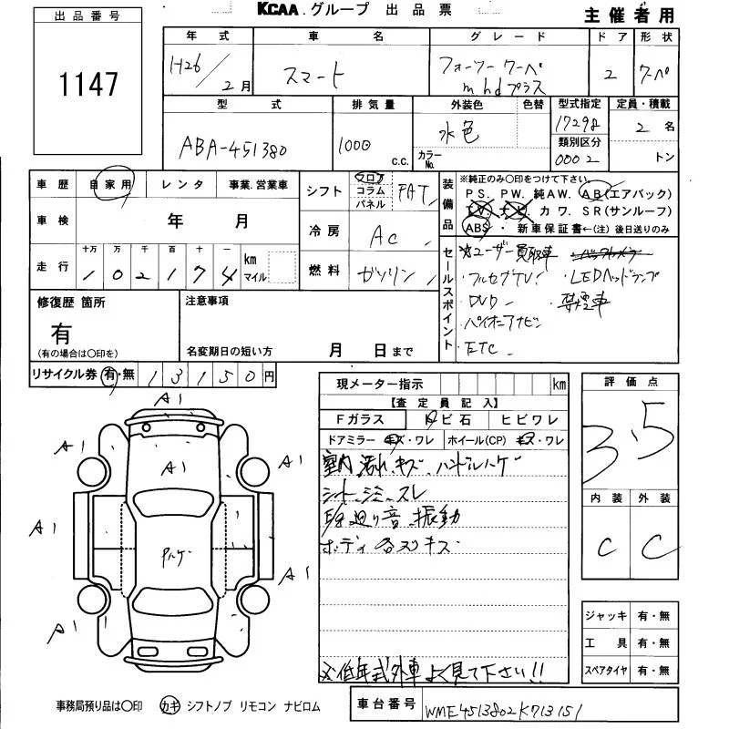 Smart FORTWO с аукциона Японии KCAA Fukuoka лот № 1147