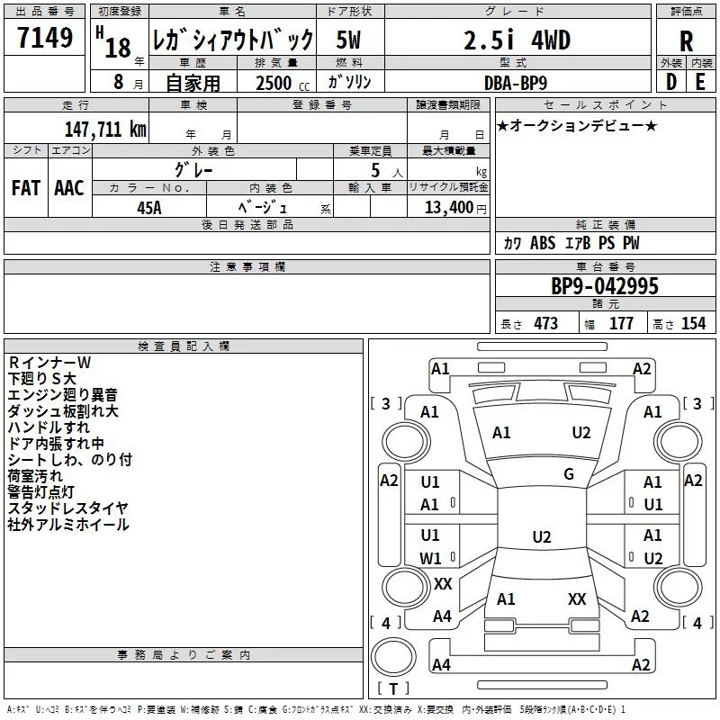 Subaru LEGACY OUTBACK с аукциона Японии TAA Hokkaido лот № 7149