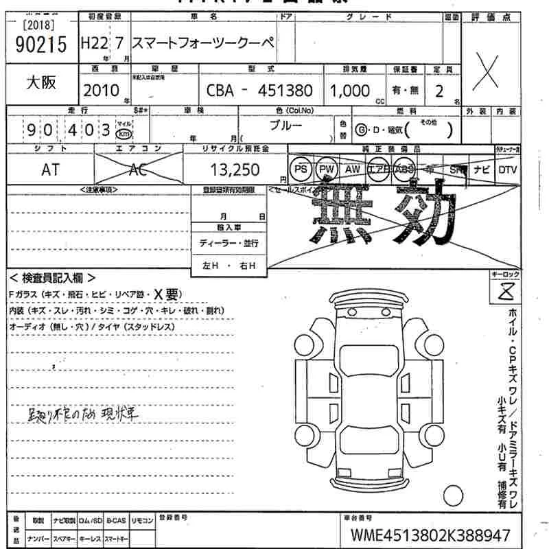 Smart FORTWO с аукциона Японии MIRIVE Osaka лот № 90215