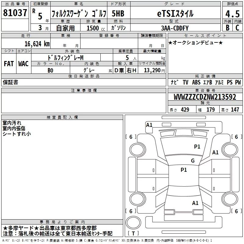 Volkswagen GOLF с аукциона Японии TAA Kanto лот № 81037